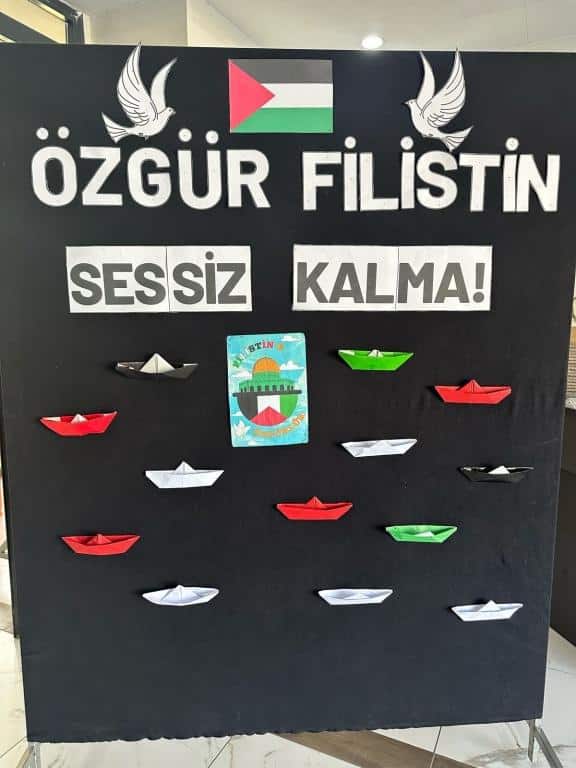 Bölgemizde ve küresel kamuoyunda büyük hassasiyetle takip edilen Filistin meselesi ile Küresel Sumud Filosu gündemi, eğitim camiamızın ortak vicdanını güçlü biçimde temsil etme sorumluluğunu kurumsal bir gereklilik olarak beraberinde getirmektedir. Türkiye Yüzyılı Maarif Modeli temel hak ve hürriyetler perspektifinde koşulsuz insan haklarına saygı, küresel barış ve dünyaya saygı ilkelerini merkeze konumlandırır. Bu yüksek kurumsal ve ahlâkî sorumluluk bilinci doğrultusunda, 7 Ekim Salı sabahı tüm okullarla eşzamanlı farkındalık etkinlikleri düzenlendi. Bu etkinliklerle, Filistin'deki insan hakları ihlallerinin sona erdirilmesine yönelik kararlı desteğimizi somut biçimde göstermek ve gençlerin insan hakları ile demokratik duyarlılığını, ortak sorumluluk bilincini en üst düzeyde pekiştirmek amaçlanmaktadır. Bu organizasyonun, öğrencilerde insan hakları savunuculuğu bilincinin köklü biçimde inşasına zemin hazırlayacağı umuduyla ilk dersimizde tüm sınıflarımızda Filistin farkındalığına yönelik çeşitli etkinlikler düzenlendi.